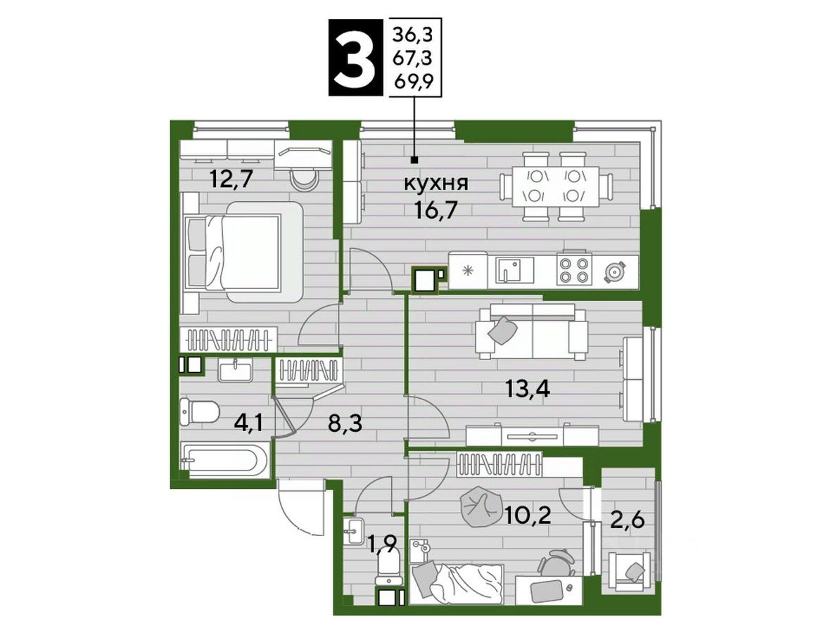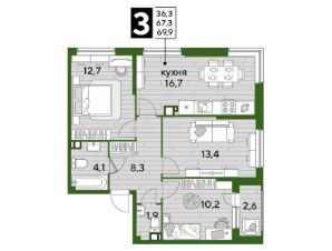 В продаже 3-комнатная квартира от застройщика! Мкр. "DOGMA PARK" г. Краснодар, Литер 36 Срок сдачи: 4 кв. 2027, общей площадью 69.9 кв.м., на 3 этаже.