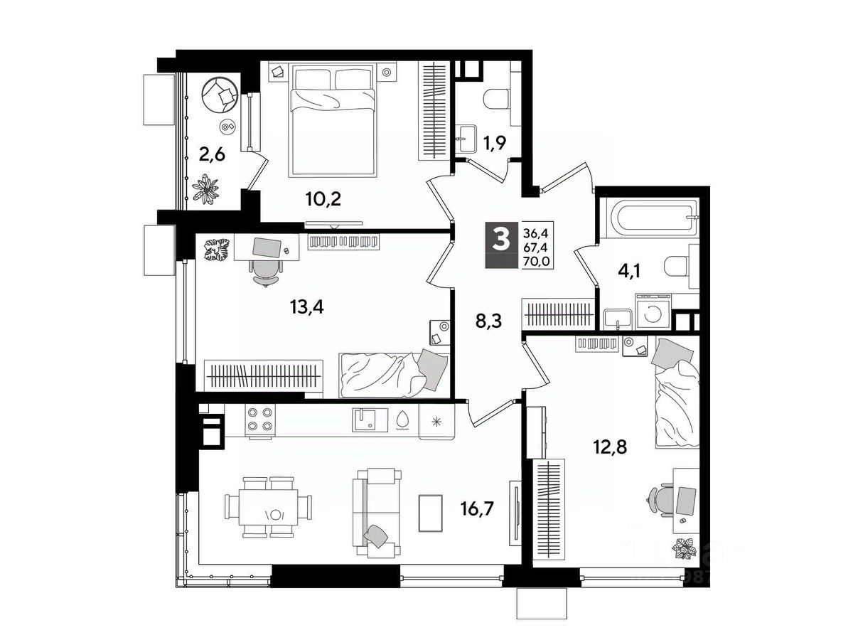 В продаже 3-комнатная квартира от застройщика! Мкр. "DOGMA PARK" г. Краснодар, Литер 32 Срок сдачи: 3 кв. 2027, общей площадью 70 кв.м., на 4 этаже.