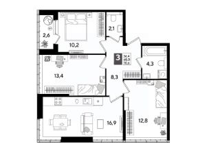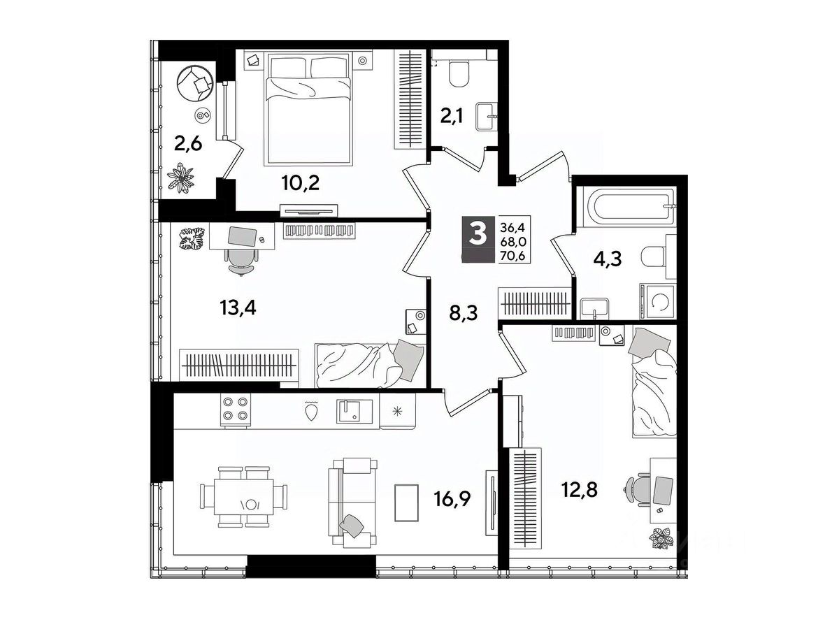 В продаже 3-комнатная квартира от застройщика! Мкр. "DOGMA PARK" г. Краснодар, Литер 31 Срок сдачи: 3 кв. 2027, общей площадью 70.6 кв.м., на 2 этаже.