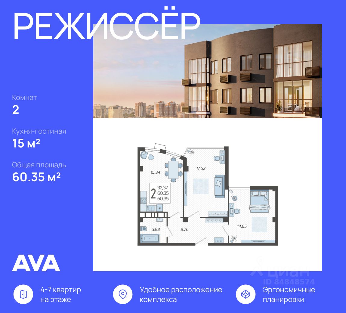 В продаже 2-комнатный апартамент 60.35 кв. м, расположенная в 4 корпусе жилого комплекса комфорт-класса "Режиссёр". Комплекс от девелопера AVA находится в развитом районе Краснодара, в 5 минутах пешком от крупного ТРЦ.