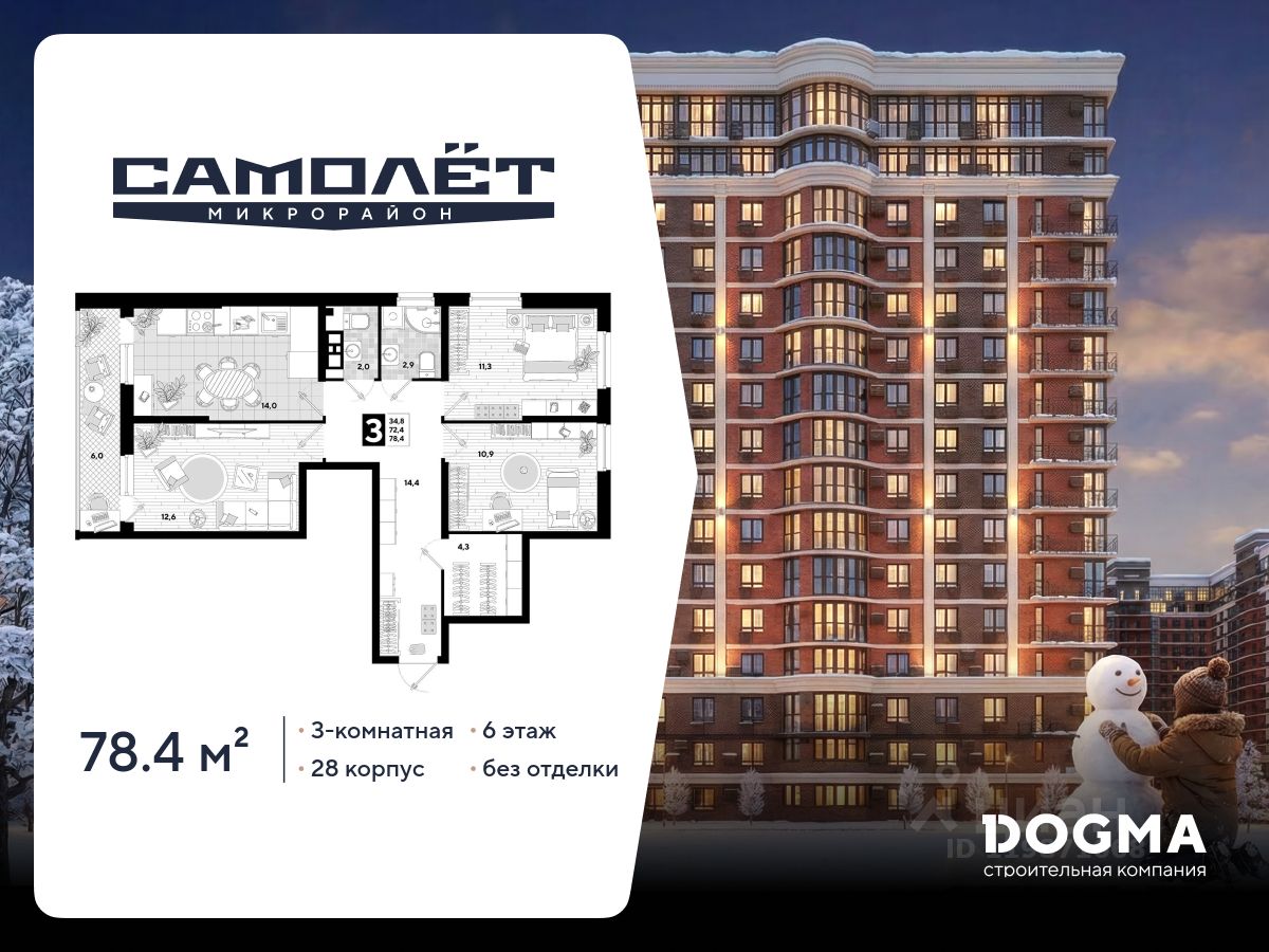 В продаже 3-комнатная квартира от застройщика! Мкр. "Самолет" 5 очередь, г. Краснодар, Литер 28 Срок сдачи: 4 кв. 2024, общей площадью 78.4 кв.м., на 6 этаже.