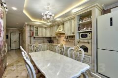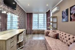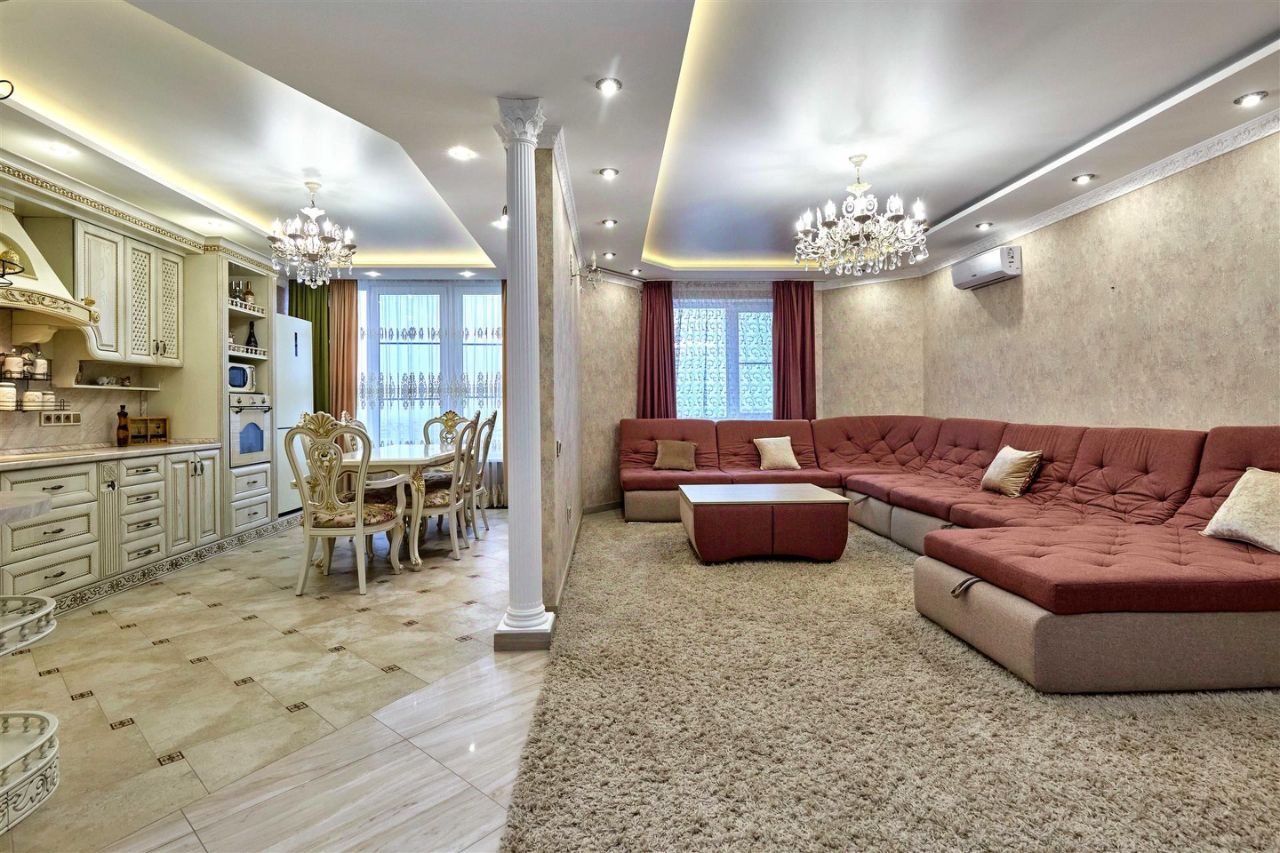В квартире выполнен современный ремонт из натуральных материалов ( мебель из массива дерева ) отдельного внимания заслуживает планировка, в которой при входе раздельный санузел и постирочная комната, далее проходим в зал и кухню-столовую и небольшая отдельная комната.