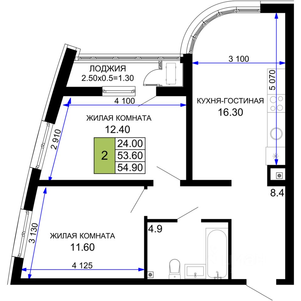 Общая площадь54,9 м²