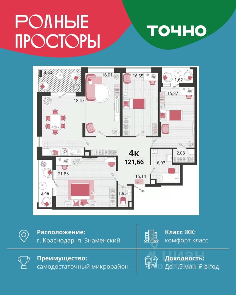"Родные просторы"- самодостаточный микрорайон, который реализован по принципу комплексного развития территории, где есть вся инфраструктура для комфортной жизни. На территории 41 га 29 домов от 9 до 24 этажей, уютные дворы со спортивными и игровыми площадками, социальные и коммерческие объекты, зеленые массивы и фонтаны. Главная точка притяжения "Родных просторов" - парк семейного отдыха площадью 9 га, 4,5 км прогулочных аллей, амфитеатр для мероприятий, кинофестивальная площадка. Особая гордость микрорайона современная школа на 1550 мест и 3 детских сада "Ладушки", "Веснушки" и "Топотушки" на 880 малышей. В центре микрорайона строятся фитнес-клуб BALANCE с акватермальным комплексом и собственная поликлиника, площадью более 5000 кв.м. Уже открыт православный храм Святых Первоверховных апостолов Петра и Павла.
