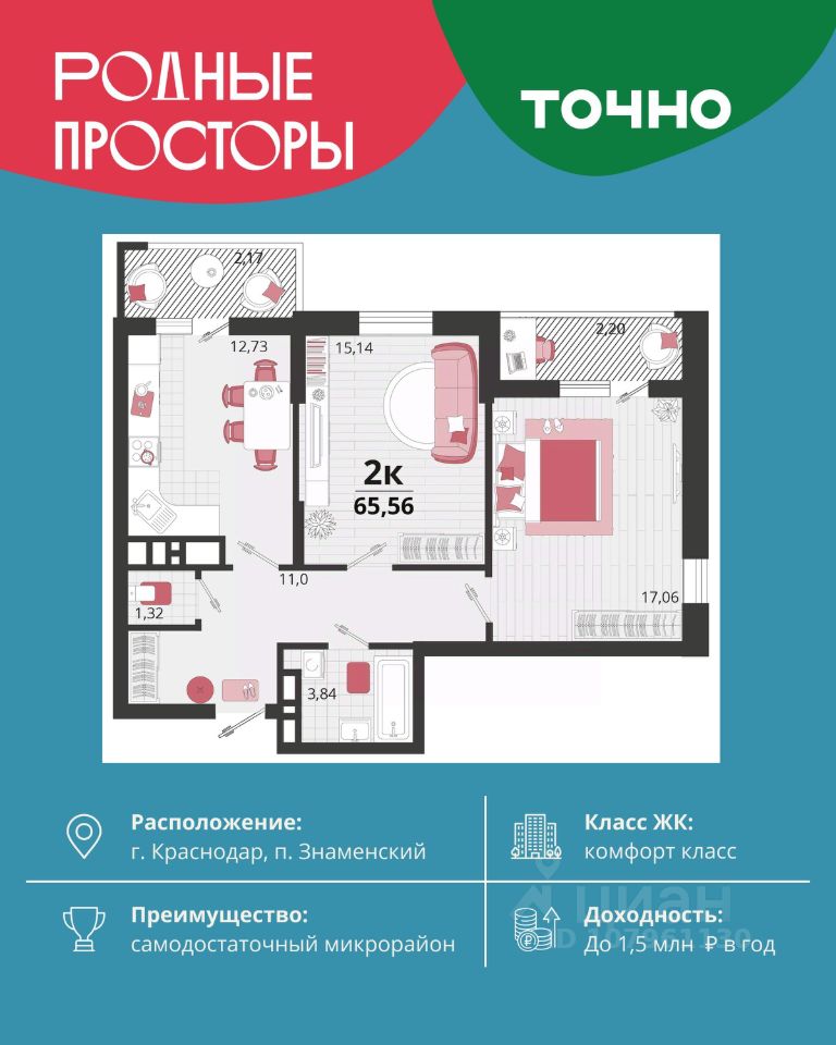 "Родные просторы"- самодостаточный микрорайон, который реализован по принципу комплексного развития территории, где есть вся инфраструктура для комфортной жизни. На территории 41 га 29 домов от 9 до 24 этажей, уютные дворы со спортивными и игровыми площадками, социальные и коммерческие объекты, зеленые массивы и фонтаны. Главная точка притяжения "Родных просторов" - парк семейного отдыха площадью 9 га, 4,5 км прогулочных аллей, амфитеатр для мероприятий, кинофестивальная площадка. Особая гордость микрорайона современная школа на 1550 мест и 3 детских сада "Ладушки", "Веснушки" и "Топотушки" на 880 малышей. В центре микрорайона строятся фитнес-клуб BALANCE с акватермальным комплексом и собственная поликлиника, площадью более 5000 кв.м. Уже открыт православный храм Святых Первоверховных апостолов Петра и Павла.