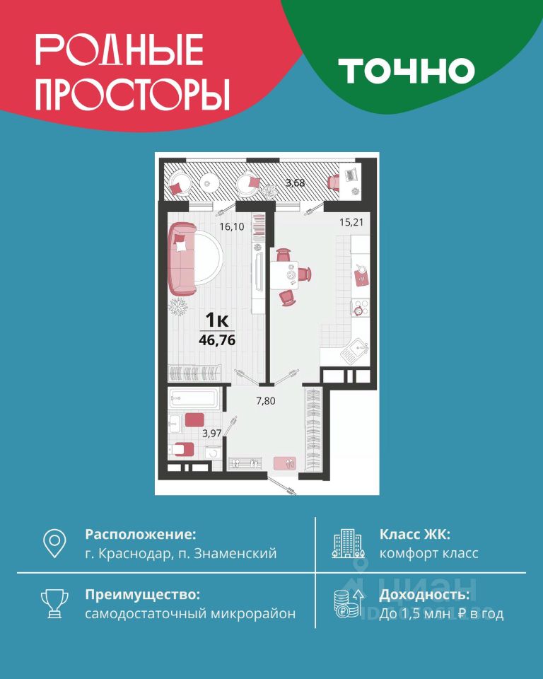 "Родные просторы"- самодостаточный микрорайон, который реализован по принципу комплексного развития территории, где есть вся инфраструктура для комфортной жизни. На территории 41 га 29 домов от 9 до 24 этажей, уютные дворы со спортивными и игровыми площадками, социальные и коммерческие объекты, зеленые массивы и фонтаны. Главная точка притяжения "Родных просторов" - парк семейного отдыха площадью 9 га, 4,5 км прогулочных аллей, амфитеатр для мероприятий, кинофестивальная площадка. Особая гордость микрорайона современная школа на 1550 мест и 3 детских сада "Ладушки", "Веснушки" и "Топотушки" на 880 малышей. В центре микрорайона строятся фитнес-клуб BALANCE с акватермальным комплексом и собственная поликлиника, площадью более 5000 кв.м. Уже открыт православный храм Святых Первоверховных апостолов Петра и Павла.
