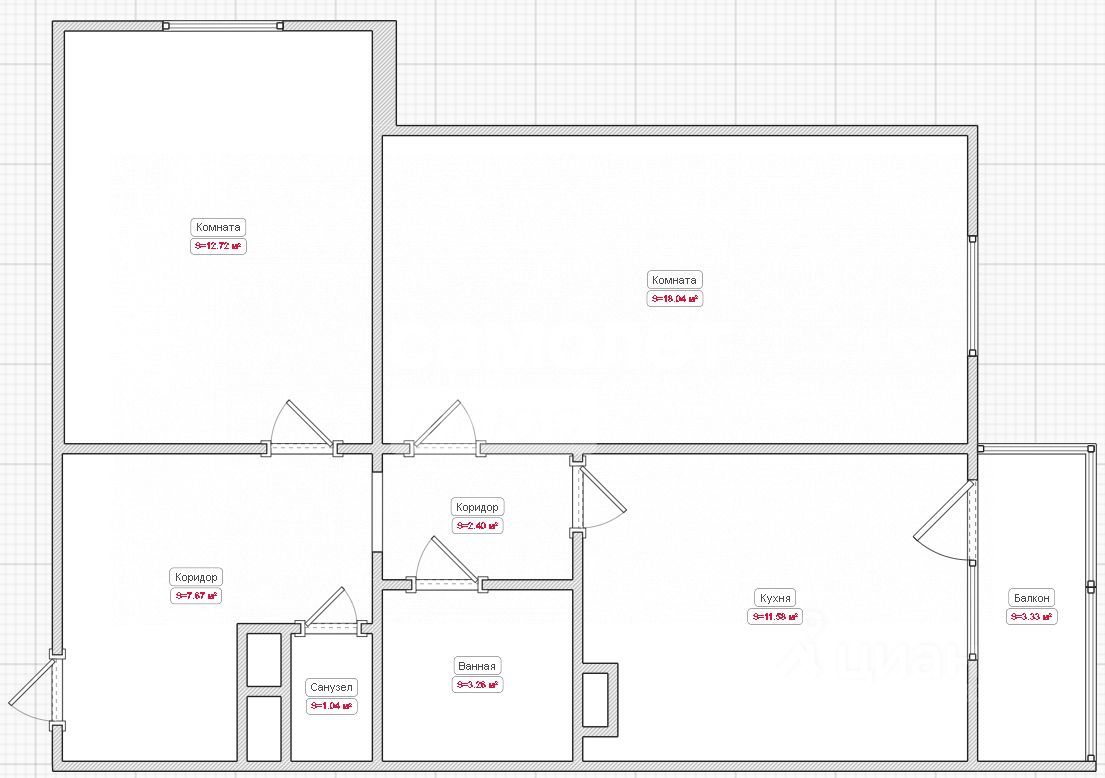 Площадь объекта 56.7м2. Высота потолка 2.8м. Кухня 11.58м2. Комната 18м2.