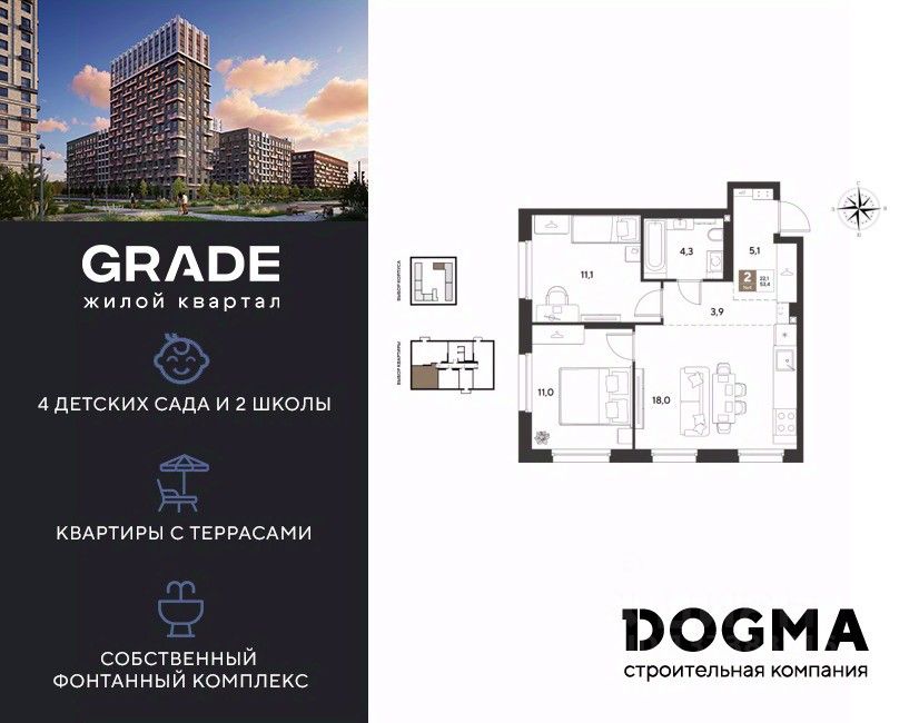 Квартал с переменной этажностью 9, 16 и 18 этажей предлагает полную инфраструктуру для жизни: 4 детских сада, 2 школы, поликлиника и ФОК расположены в шаговой доступности.