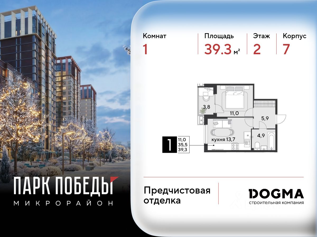 Срок сдачи: 2 кв. 2026, общей площадью 39.3 кв.м., на 2 этаже.