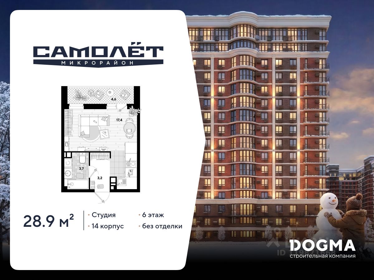 В продаже квартира-студия от застройщика! Мкр. "Самолет" 3 очередь, г. Краснодар, Литер 14 Срок сдачи: 4 кв. 2023, общей площадью 28.9 кв.м., на 6 этаже.
