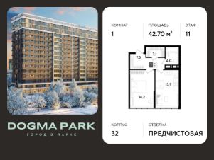 В продаже 1-комнатная квартира от застройщика! Мкр. "DOGMA PARK" г. Краснодар, Литер 32 Срок сдачи: 3 кв. 2027, общей площадью 42.7 кв.м., на 11 этаже.