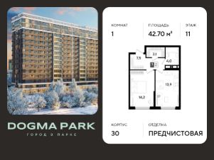 В продаже 1-комнатная квартира от застройщика! Мкр. "DOGMA PARK" г. Краснодар, Литер 30 Срок сдачи: 3 кв. 2027, общей площадью 42.7 кв.м., на 11 этаже.
