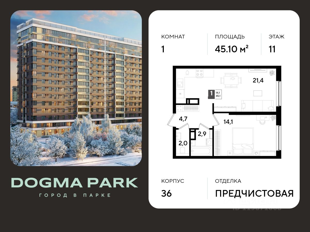 В продаже 1-комнатная квартира от застройщика! Мкр. "DOGMA PARK" г. Краснодар, Литер 36 Срок сдачи: 4 кв. 2027, общей площадью 45.1 кв.м., на 11 этаже.