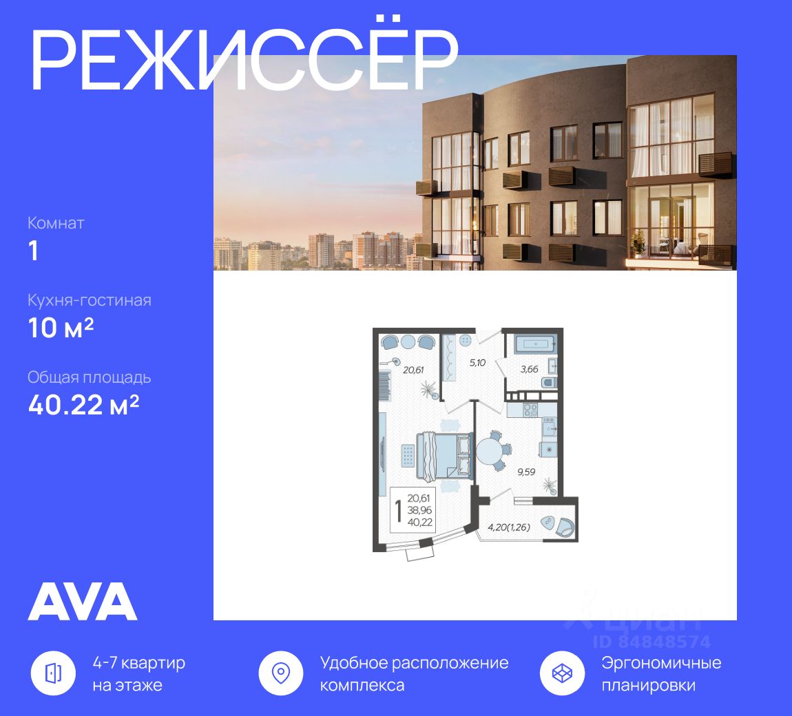 В продаже 1-комнатная квартира 40.22 кв. м, расположенная в 4 корпусе жилого комплекса комфорт-класса "Режиссёр". Комплекс от девелопера AVA находится в развитом районе Краснодара, в 5 минутах пешком от крупного ТРЦ.