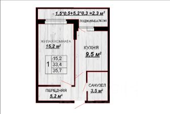 Koмнатa 15,2м2, кухня 9,5м2 c выхoдом нa пpосторную лoджию. Есть место для гардеробной. Крупноформатные окна, благодаря которым в квартире очень светло.