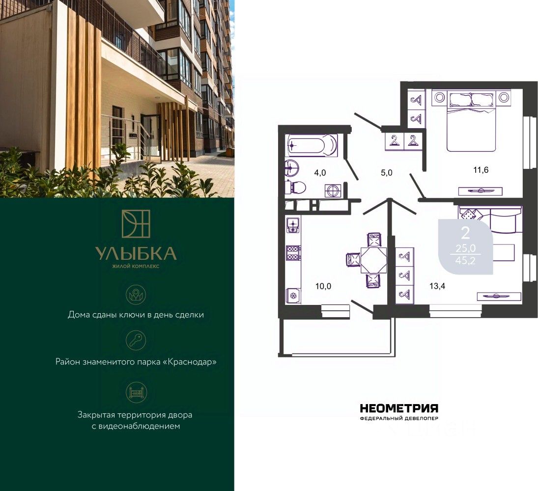 Продается квартира в жилом комплексе "Улыбка" от федерального девелопера "Неометрия". Все дома сданы, ключи в день сделки.