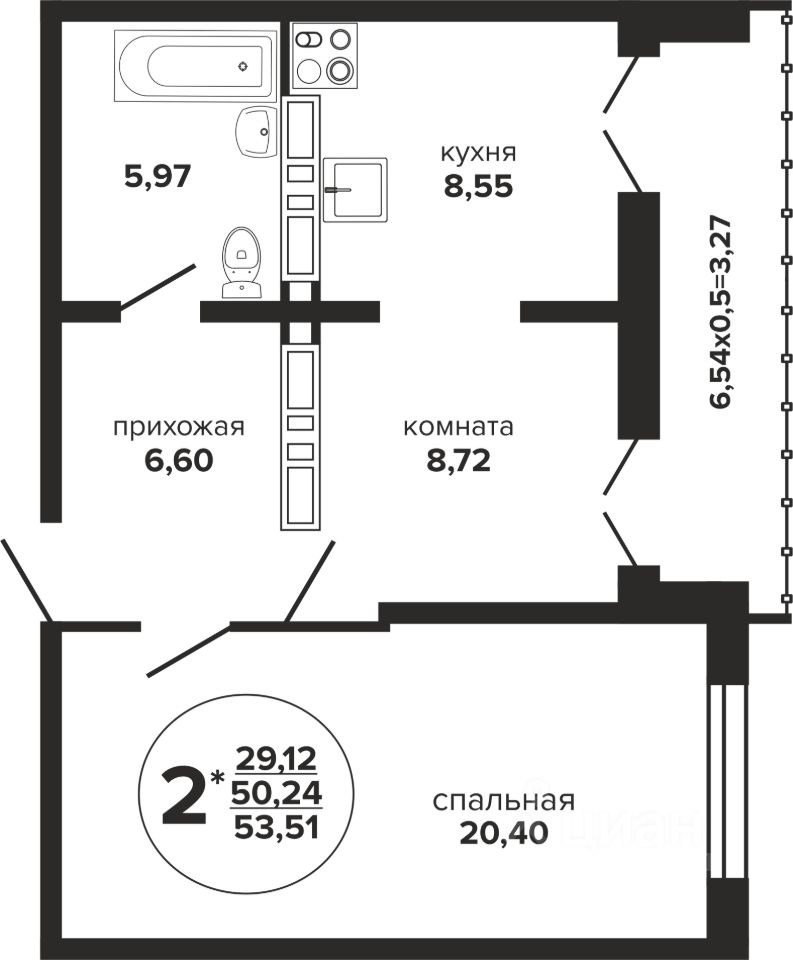 Общая площадь53,51 м²