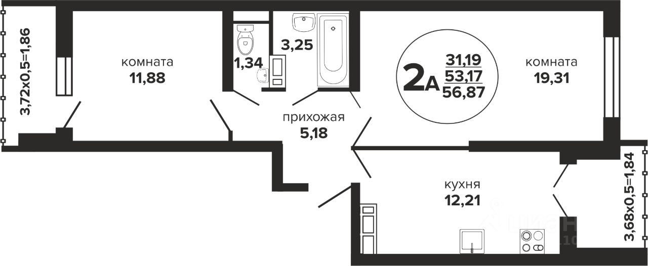 Общая площадь56,87 м²