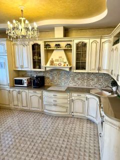 Дом оборудован консьержем, пассажирским и грузовым лифтами. Территория закрытая, охраняемая, с подземной парковкой. В квартире установлены тёплые полы. Планировка включает три изолированные комнаты, просторную кухню площадью 33 м² с современной техникой (холодильник, посудомоечная машина). Санузел раздельный, выполнен с декоративным оформлением. Предусмотрены гардеробная и вместительные шкафы в прихожей. Имеется застеклённая и утеплённая лоджия. Окна выходят во двор.