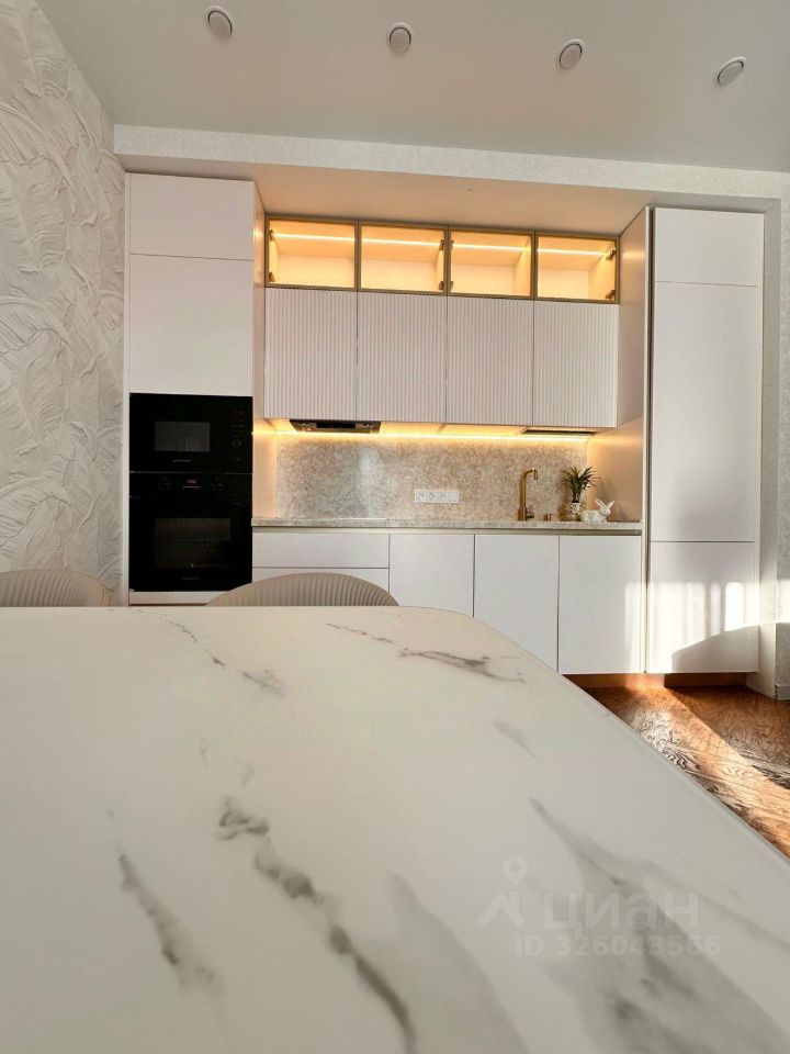 - посудомоечная машина;- индукционная варочная панель;- электрический духовой шкаф;- кухонная вытяжка;- встроенный холодильник ;- эксклюзивная обеденная группа с мраморным столом.
