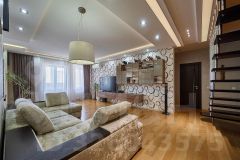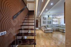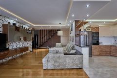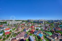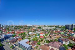 Квартира состоит из двух уровней, идеально подойдёт для семей с детьми. На первом этаже огромная кухня-гостиная, гостевая и детская спальни, душевая, санузел и гардеробная. На втором этаже просторная ванная комната, хозяйская спальня с большой гардеробной и кабинетом. Из окон квартиры открывается отличный вид на весь центр Краснодара.
