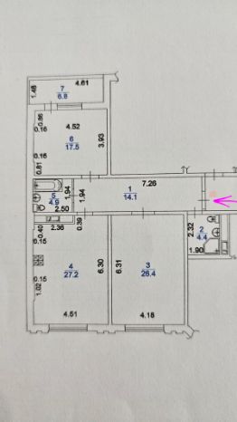 Квартира состоит из двух просторных квадратных комнат и огромной квадратной кухни площадью 27 кв.м. (ширина 4,5 метра)