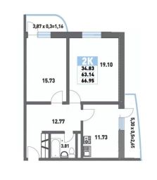 площадь кухни 11,73 кв.м. с выходом на балкон, комнат - 15,7 и 19,1 кв.м. Одна из комнат имеет выход на второй балкон