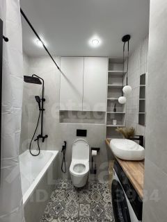 В квартире установлена полноценная встроенная кухня с техникой Bosch (варочная панель, духовой шкаф, посудомоечная машина, холодильник и микроволновка), а ванная комната совмещенного типа обустроена с применением керамогранита и включает стиральную машину.
