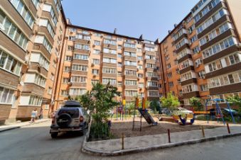 Дом с отличным местоположением и благоустроенной придомовой территорией. Современные и безопасные детские площадки.