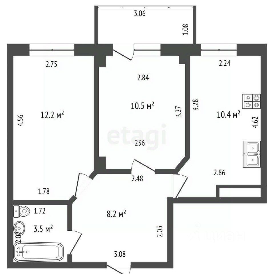Объект отличается продуманной планировкой: просторная кухня 10,4 кв.м., две изолированные комнаты (12,2 и 10,5 кв.м.), совмещенный санузел и широкий коридор 8,2 кв.м., что обеспечивает комфортное использование пространства.