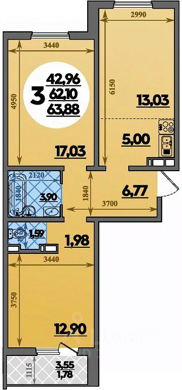 Продаётся 3-комнатная квартира в сданном доме (Литер 13 ), срок сдачи: I-кв. 2025, общей площадью 63.88 кв.м., на 4 этаже. РАСПОЛОЖЕНИЕ