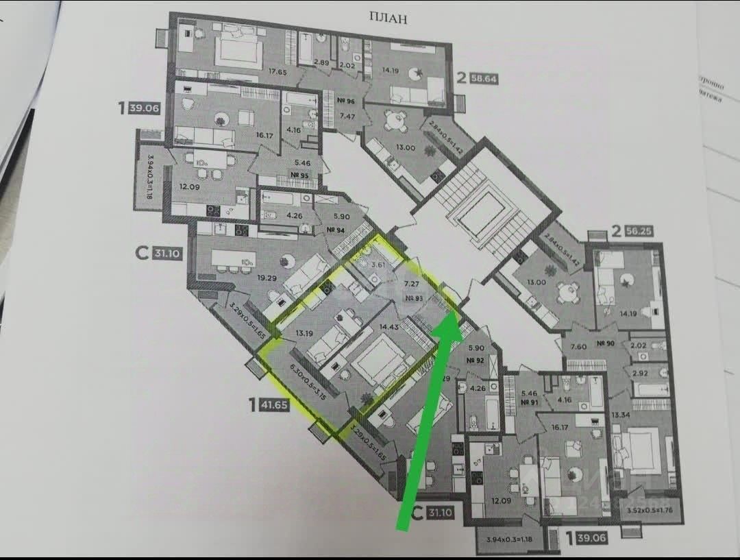 В продаже однокомнатная квартира 41,65 кв. м., где спальня 14,43 кв.м., кухня 13,19 кв. м., прихожая 7,27 кв. м., санузел 3,61 кв. м. балкон 6,3 кв.м..