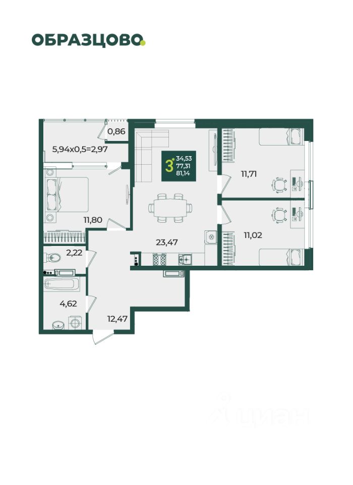 Продаётся 3-комнатная квартира в строящемся доме (Литер 4), срок сдачи: III-кв. 2026, общей площадью 81.14 кв.м., на 9 этаже. Новый жилой комплекс "Микрорайон Образцово" от застройщика "ГК ИНСИТИ" расположен по адресу: Россия, Краснодар, улица 1 Мая