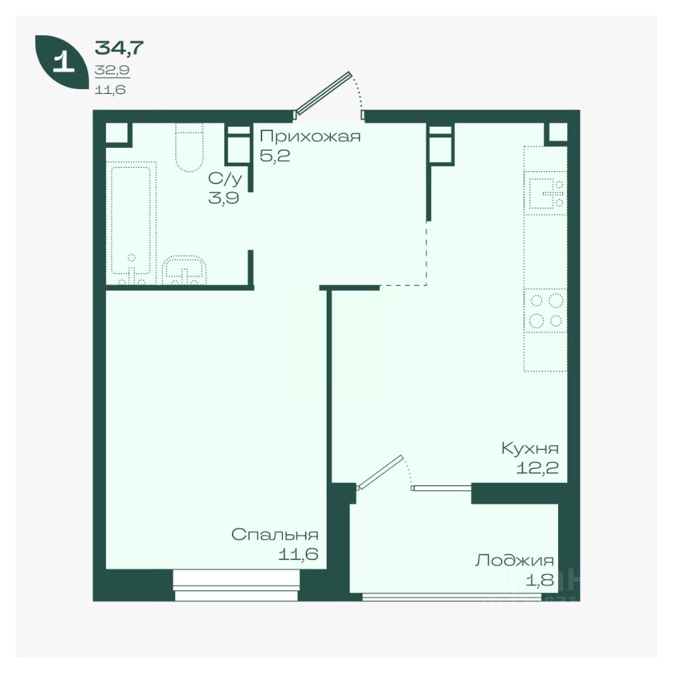 Общая площадь34,7 м²