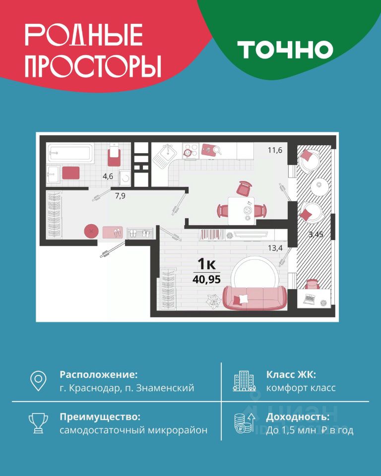 "Родные просторы"- самодостаточный микрорайон, который реализован по принципу комплексного развития территории, где есть вся инфраструктура для комфортной жизни. На территории 41 га 29 домов от 9 до 24 этажей, уютные дворы со спортивными и игровыми площадками, социальные и коммерческие объекты, зеленые массивы и фонтаны. Главная точка притяжения "Родных просторов" - парк семейного отдыха площадью 9 га, 4,5 км прогулочных аллей, амфитеатр для мероприятий, кинофестивальная площадка. Особая гордость микрорайона современная школа на 1550 мест и 3 детских сада "Ладушки", "Веснушки" и "Топотушки" на 880 малышей. В центре микрорайона строятся фитнес-клуб BALANCE с акватермальным комплексом и собственная поликлиника, площадью более 5000 кв.м. Уже открыт православный храм Святых Первоверховных апостолов Петра и Павла.