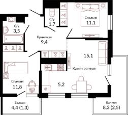 Продаётся 2-комнатная квартира в сданном доме (Литер 2.2), срок сдачи: II-кв. 2023, общей площадью 63.6 кв.м., на 1 этаже. Жилой комплекс по адресу: г. Краснодар, Прикубанский внутригородской округ, отделение почтовой связи Калинино.