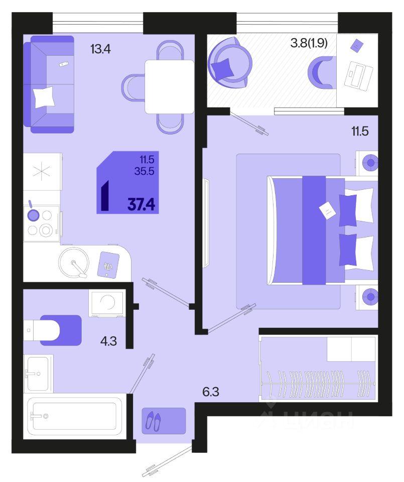 Продаётся 1-комнатная квартира в строящемся доме (Квартал 1.5 - Литер 1), срок сдачи: IV-кв. 2026, общей площадью 37.4 кв.м., на 2 этаже. Жилой район "Первое