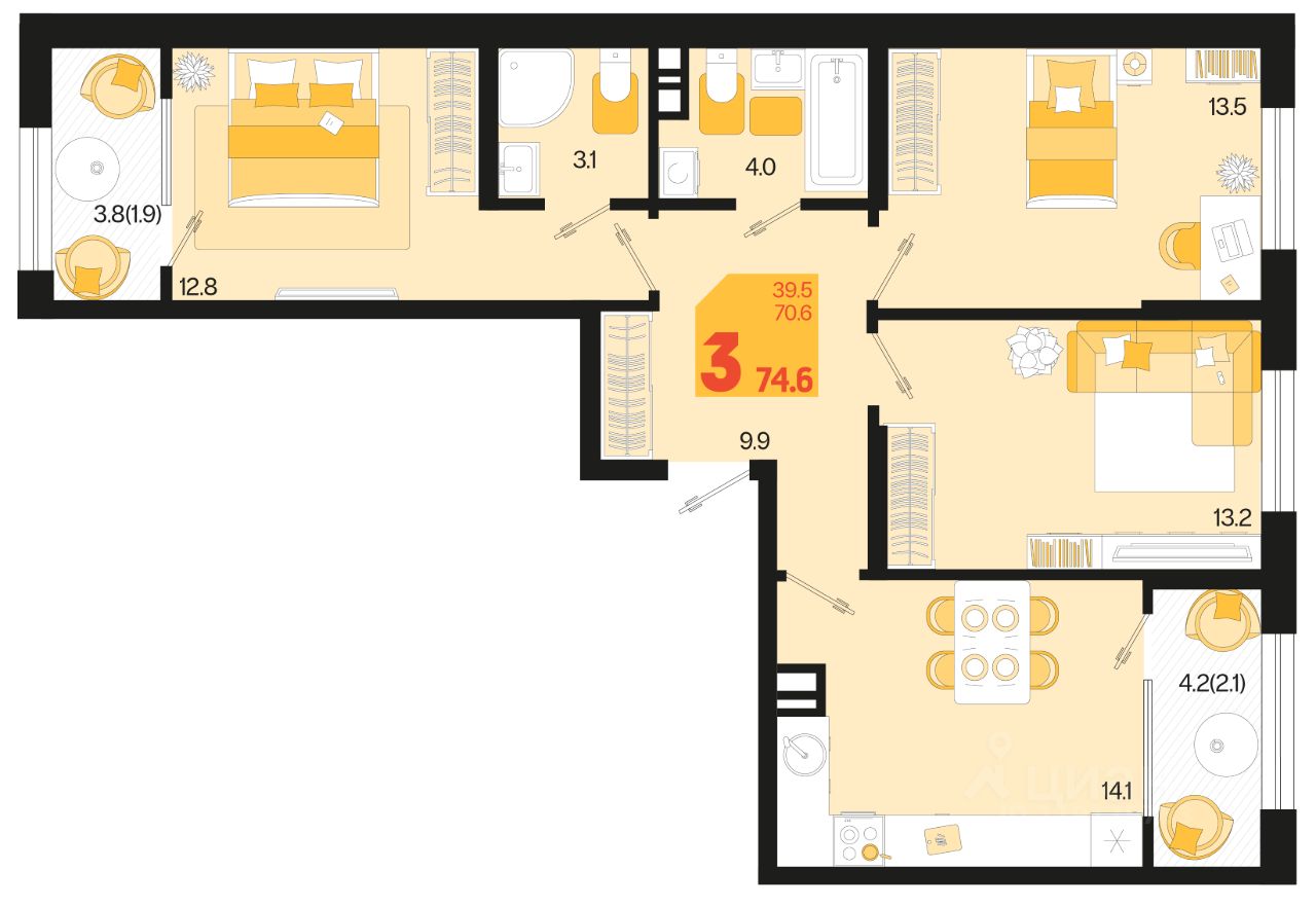 Продаётся 3-комнатная квартира в строящемся доме (Квартал 1.4 - Литер 2), срок сдачи: I-кв. 2027, общей площадью 74.6 кв.м., на 7 этаже. Жилой район "Первое