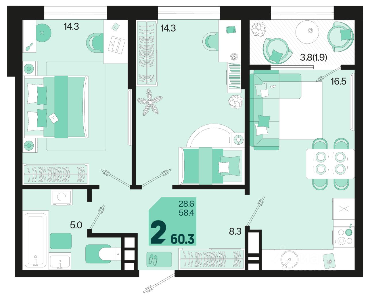 Продаётся 2-комнатная квартира в строящемся доме (Квартал 1.4 - Литер 2), срок сдачи: I-кв. 2027, общей площадью 60.3 кв.м., на 10 этаже. Жилой район "Первое