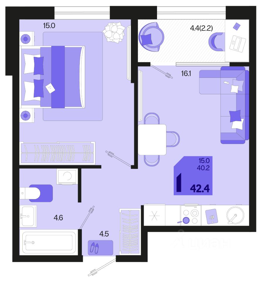 Продаётся 1-комнатная квартира в строящемся доме (Квартал 1.2 - Литер 1), срок сдачи: III-кв. 2026, общей площадью 42.4 кв.м., на 2 этаже. Жилой район "Первое