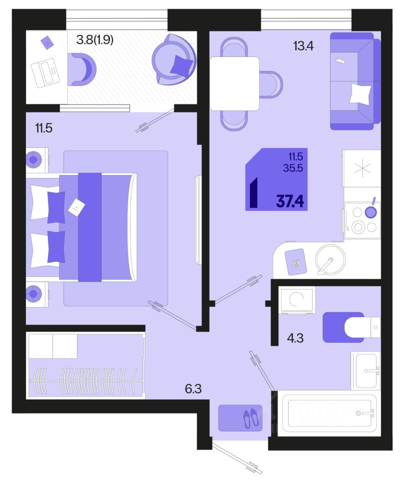Продаётся 1-комнатная квартира в строящемся доме (Квартал 1.1 - Литер 2), срок сдачи: II-кв. 2026, общей площадью 37.4 кв.м., на 2 этаже. Жилой район "Первое