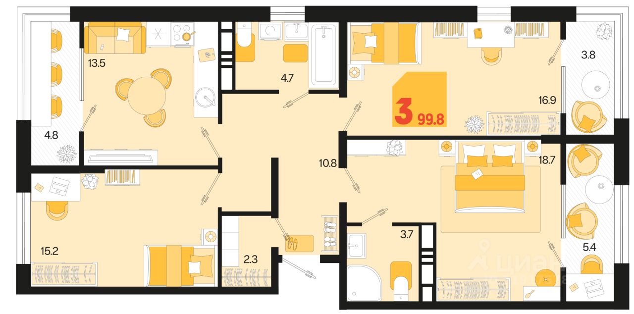 Продаётся 3-комнатная квартира в строящемся доме (Квартал 1.1 - Литер 2), срок сдачи: IV-кв. 2026, общей площадью 92.8 кв.м., на 18 этаже. Жилой район "Первое