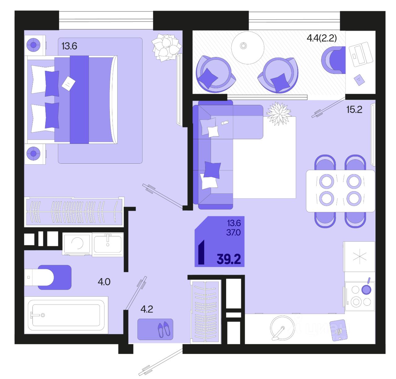 Продаётся 1-комнатная квартира в строящемся доме (Квартал 1.5 - Литер 2), срок сдачи: IV-кв. 2026, общей площадью 39.2 кв.м., на 13 этаже. Жилой район "Первое