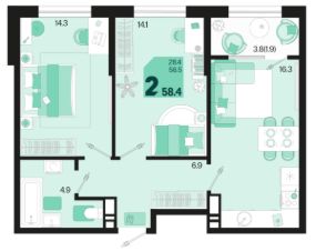 Продаётся 2-комнатная квартира в строящемся доме (Квартал 1.6 - Литер 1), срок сдачи: IV-кв. 2026, общей площадью 58.4 кв.м., на 6 этаже. Жилой район "Первое