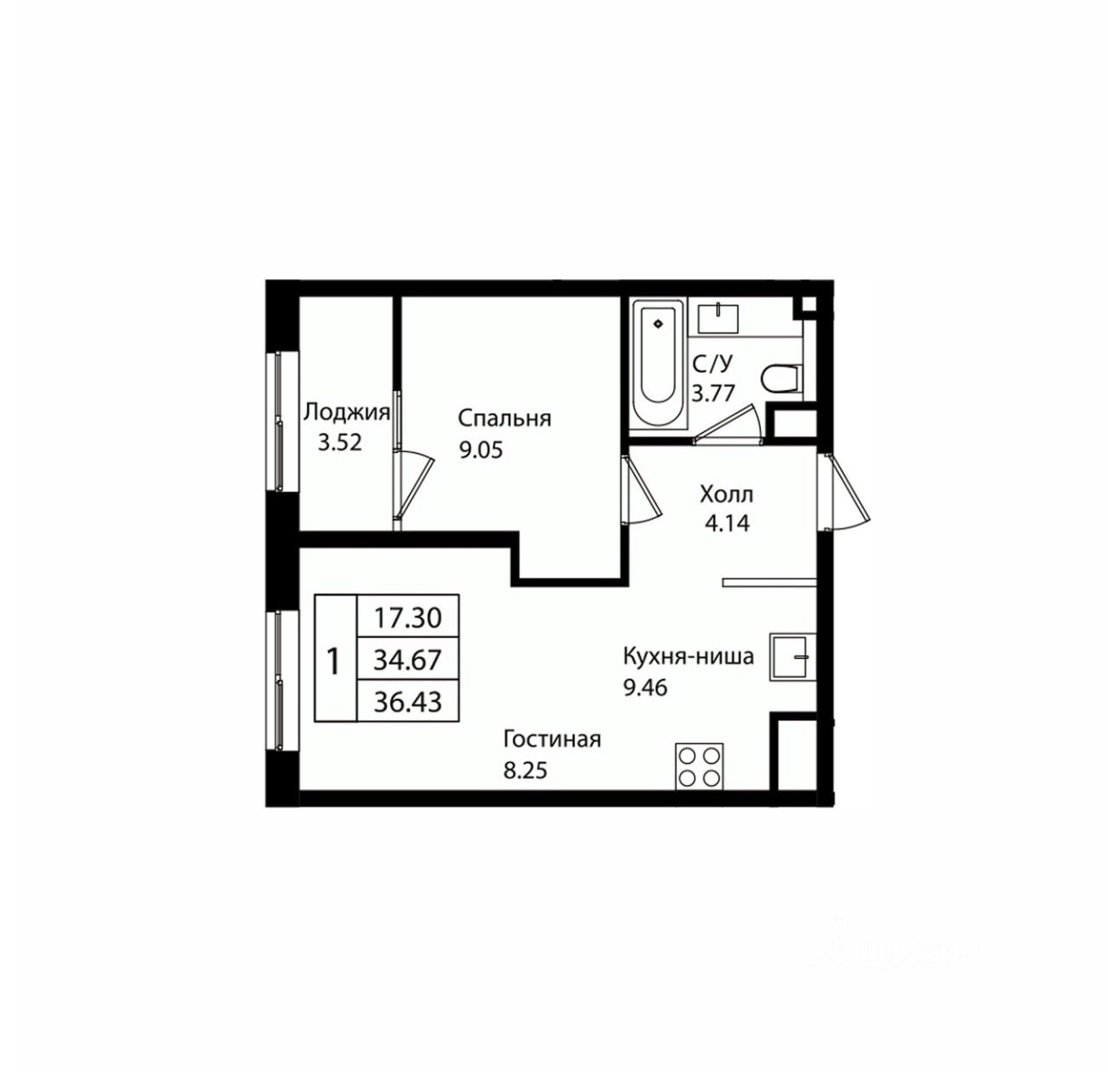 Общая площадь36,43 м²