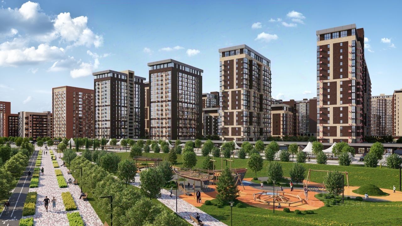 от 9 до 24 этажей, уютные дворы со спортивными и игровыми площадками,
