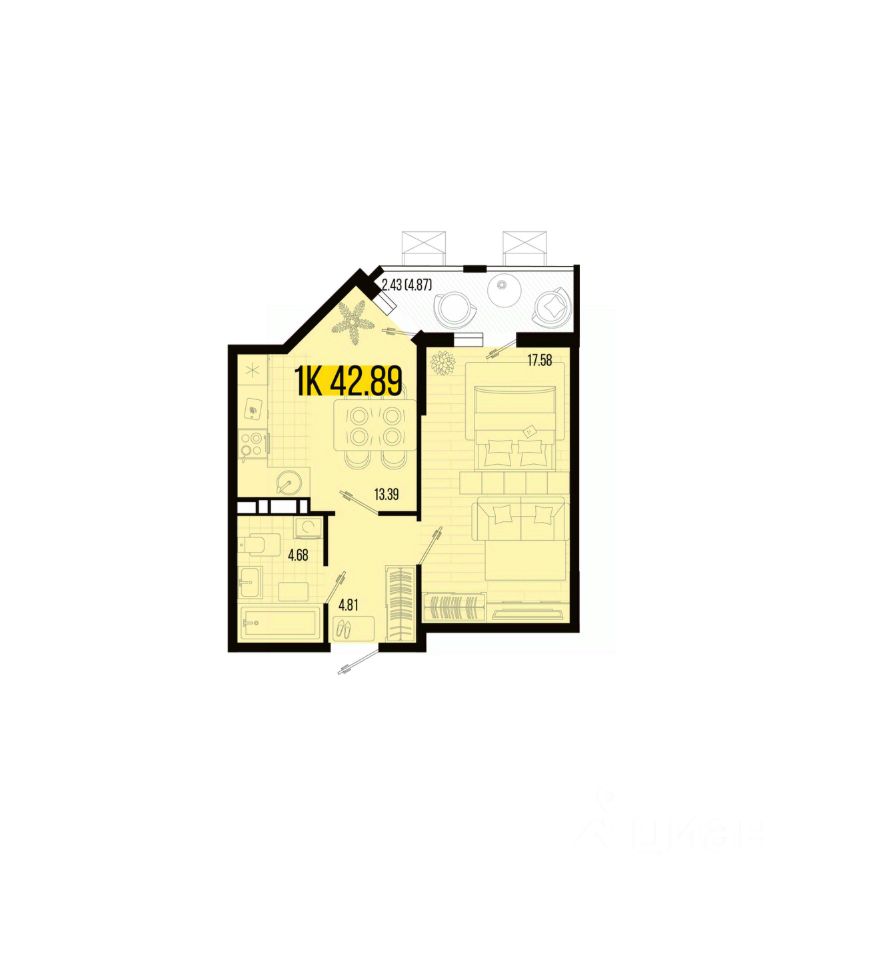 Общая площадь42,89 м²