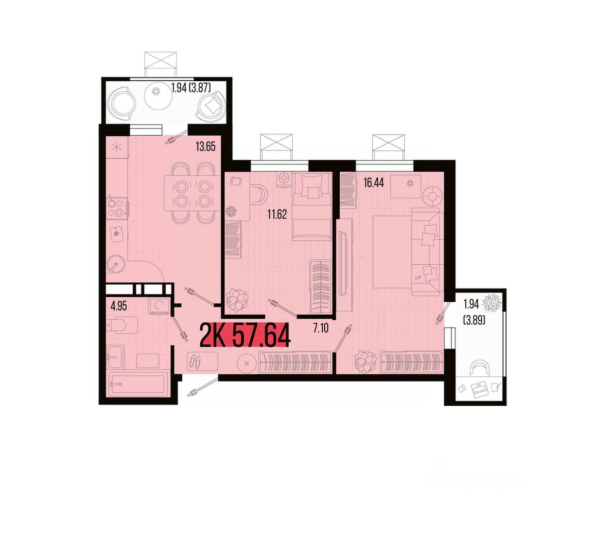Общая площадь57,64 м²