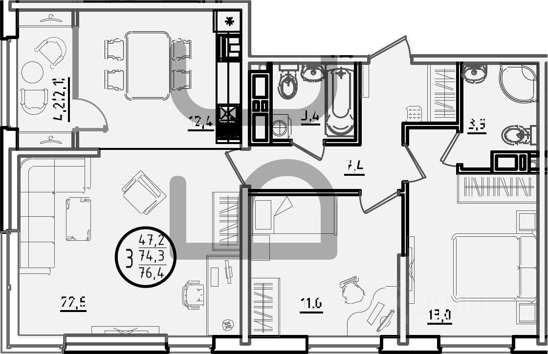 Общая площадь76,4 м²