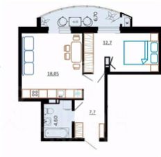 Большая кухня-гостиная 18,05 м2 позволяет разместить большой диван, обеденную группу, телевизор и кухонный гарнитур 4,2 погонных метра (на 7 полноценных секций, включая пеналы под холодильик и духовой шкаф).